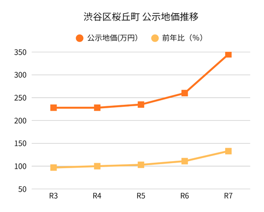 渋谷区における公示地価の推移を見ると、令和5年から令和7年にかけて平均約16.5%の累積上昇が確認されました。